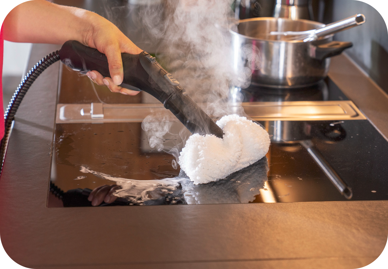 Для уборки с помощью пароочистителя понадобится только вода и тряпка (затирать размягченные загрязнения). В специальный резервуар заливается обычная вода из крана , нагревается и под давлением подаётся через насадку. Пар не только борется с загрязнениями, но убивает микробы, пылевые клещи, является мощным дезинфектором.